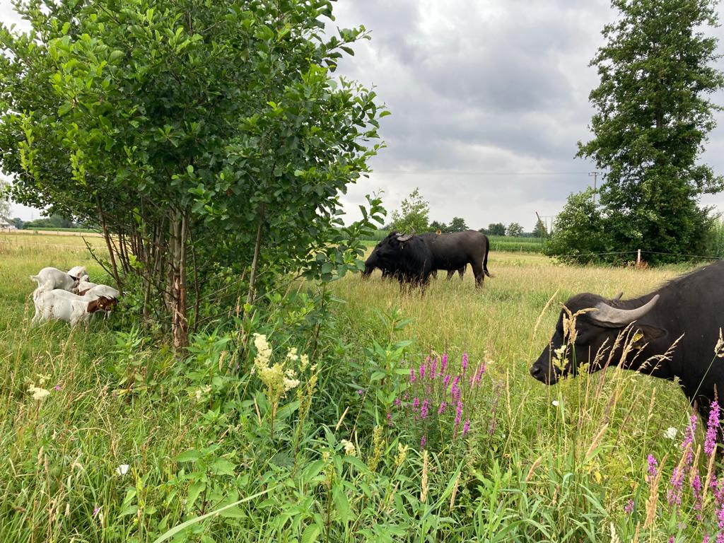 Auf unserem Bauernhof leben: Wasserbüffel, Ziegen, Schafe, Schweine, Hasen, Hühner, Enten, Pferde, Hunde, Katzen und liebe Menschen