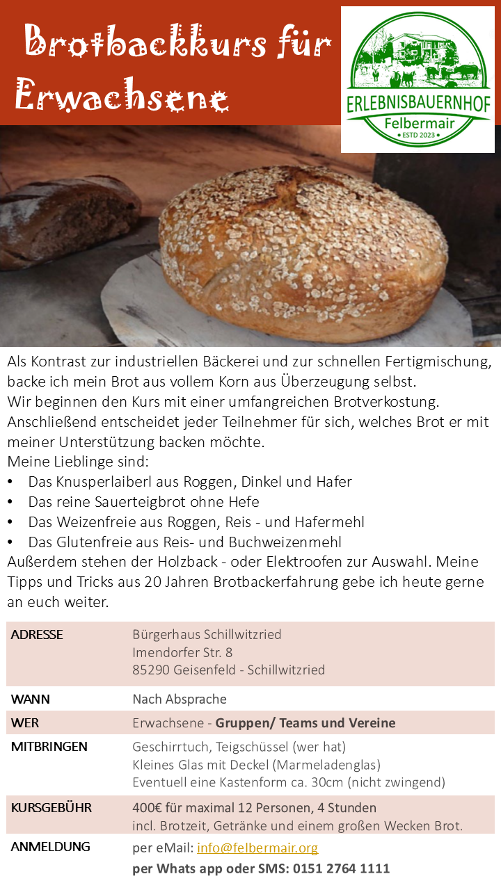 Die Teilnehmer lernen die unterschiedlichen Getreidesorten kennen. Wir mahlen unser Getreide nicht nur mit der Mühle, sondern auch mit der Hand. Je nach Getreidesorten stellen wir die beiden Backtriebmittel Sauerteig und Hefe vor. Zum Schluss lassen wir uns das selbstgebackene Brot schmecken.